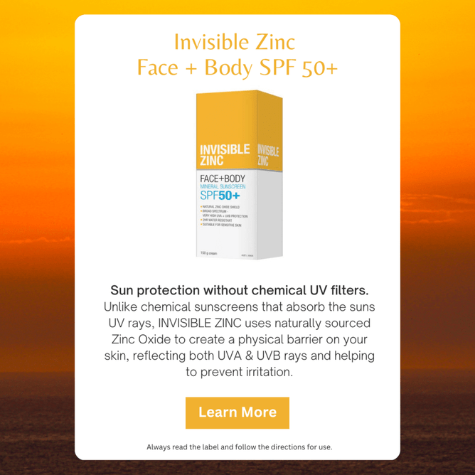 Unlike chemical sunscreens that absorb the sun's UV rays, INVISIBLE ZINC uses naturally sourced Zinc Oxide to create a physical barrier on your skin, reflecting both UVA & UVB rays and helping to prevent irritation.
