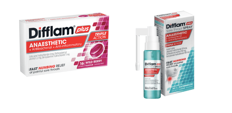 Difflam Plus Sore Throat Spray and Difflam Plus Lozenges are designed to provide FAST relief of painful conditions of the throat and mouth. Both contain anti-inflammatory and anaesthetic ingredients that act locally to reduce swelling and pain.