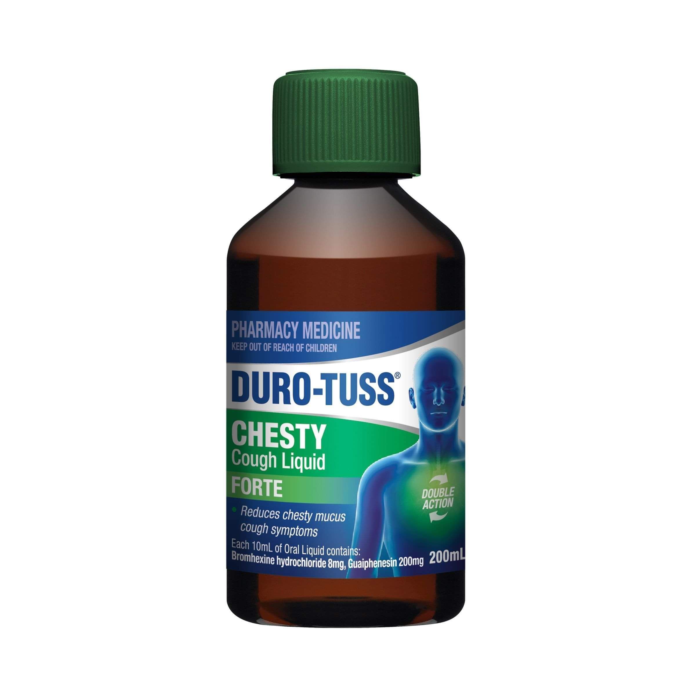 Duro-Tuss Chesty Forte Cough Liquid has a double action formula that contains two active ingredients: Bromhexine (a mucolytic) and Guaiphenesin (an expectorant) to break down and clear heavy chest congestion.