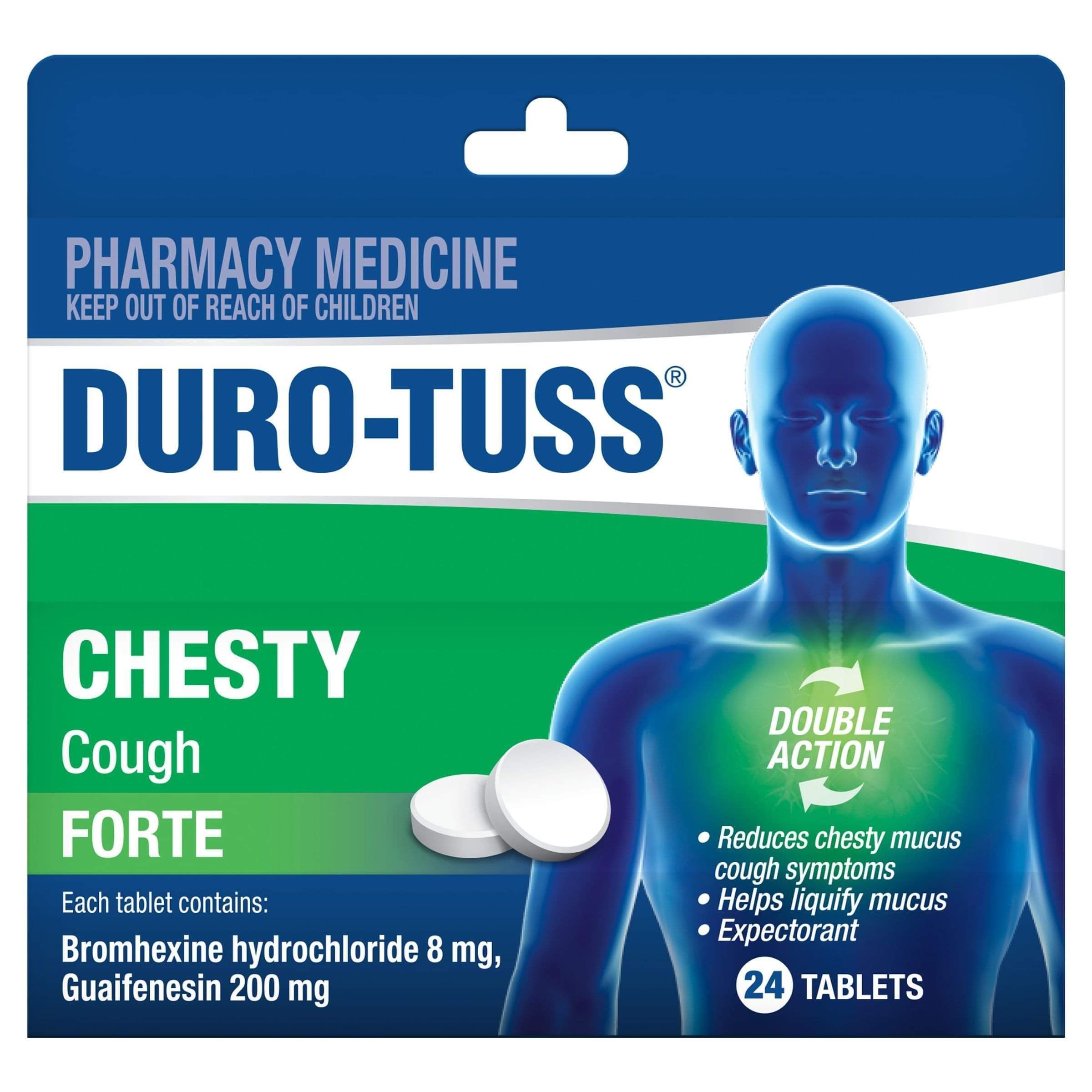 Duro-Tuss Chesty Forte Cough Tablets have the same double action formula as the Duro-Tuss Chesty Forte Cough Liquid, but in a convenient small and easy to swallow tablet format. This full strength cough medicine provides effective relief for chesty, productive coughs, by helping to break down, loosen and clear mucus from the chest.